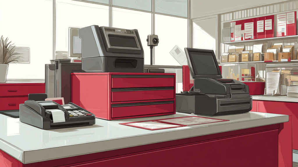 - A camera behind and slightly above the cashier shows bills, receipts, and the customer’s face.